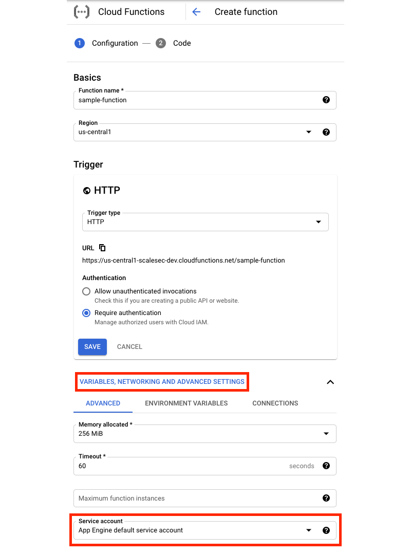 It’s important to note that in order to assign a non-default service account to a Cloud Function, that service account must first be created. In the cloud console, once the service account is created and the proper permissions are assigned, click the VARIABLES, NETWORKING AND ADVANCED SETTINGS option in the Cloud Functions Create UI. Next, select the target service account that was previously created.