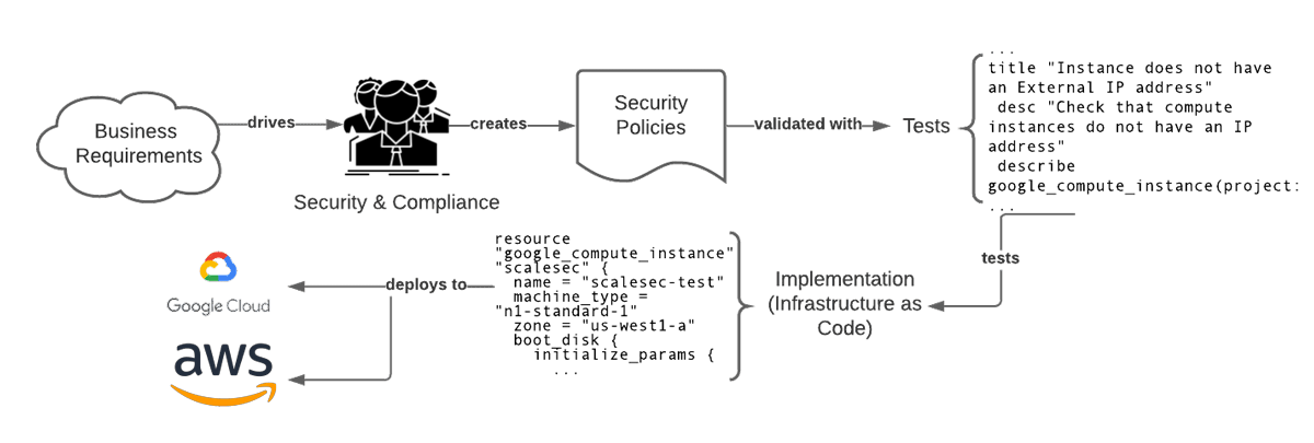Security and compliance requirements start from business drivers. Meeting requirements highlighted by demonstrating compliance with regimes such as FedRAMP, GDPR, PCI-DSS, and HITRUST help break barriers to market entrance. What this means is that there should be good communication between compliance teams and the engineers that implement infrastructure. Having sessions for engineering teams to translate security requirements into tests (that may not yet pass since the infrastructure hasn’t been created/modified yet) using a selected framework is key to ensuring success.